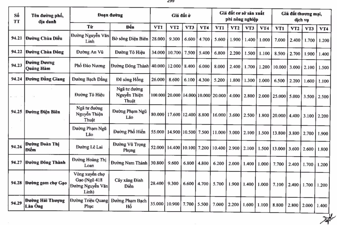 Mặt đường Nguyễn Thiện Thuật (đoạn đê sông Hồng – Phan Đình Phùng) được định giá 40 triệu đồng/m², tương đương tăng 10,8 lần so với mức trước.