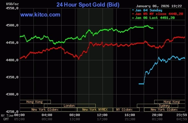 Vào buổi sáng ngày 6/1, giá vàng giao ngay tăng 45 USD, chạm 4.494 USD và nhanh chóng vượt qua mức 4.500 USD – chỉ cách đỉnh 4.549 USD ghi nhận vào ngày 24/12/2025 khoảng 50 USD. Động lực chính là nhu cầu trú ẩn tăng cao sau khi Mỹ thực hiện các biện pháp áp lực lên Venezuela và bắt giữ Tổng thống Nicolas Maduro.
