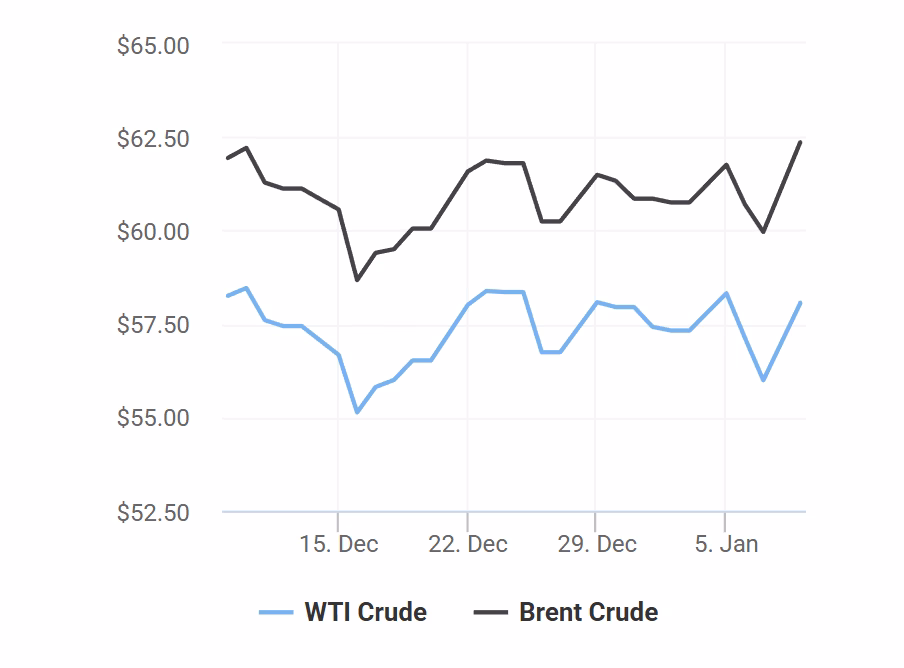 Giá dầu thô Brent đạt 62,42 USD/thùng, trong khi dầu thô Texas (WTI) ghi mức 58,13 USD/thùng. Cả hai chỉ số đều tăng khoảng 0,7% so với phiên giao dịch ngày trước, tiếp nối đà tăng hơn 3% vào ngày 8/1.