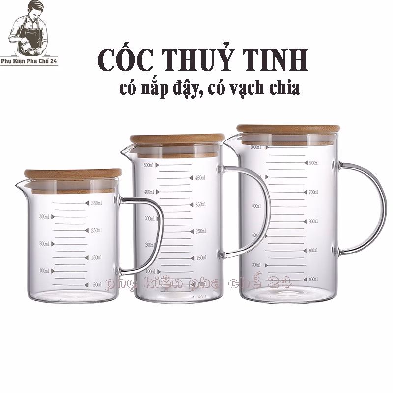 🔥 Ly Cốc Ca Thủy Tinh Glass Cup Chia Vạch Đo Lường Định Lượng Đong Thể Tích Có Nắp Gỗ Đậy Chịu Nhiệt đang giảm giá!